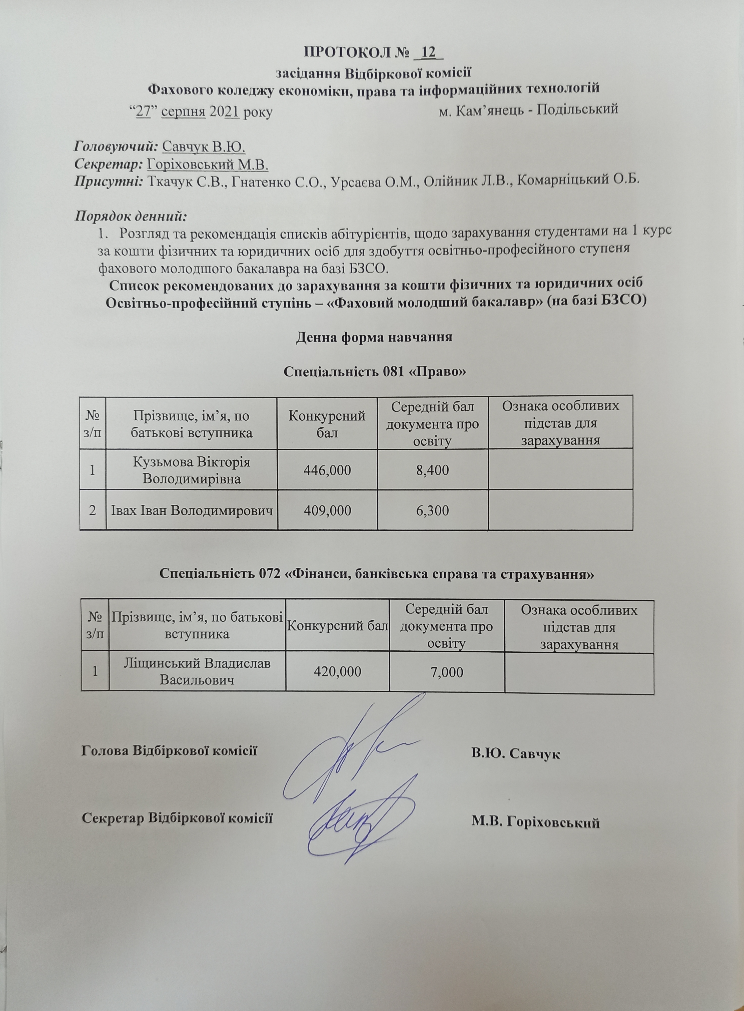 Рішення відбіркової комісії щодо надання рекомендацій на зарахування